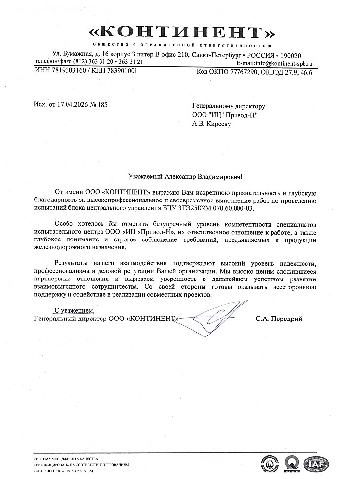Коллектив Привод-Н получил благодарственное письмо от ООО «КОНТИНЕНТ» в котором выражается признательность и глубокая благодарность за высокопрофессиональную и своевременную работу по проведению испытаний